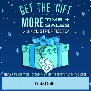 You can try it out for a 30% discount on the first month. If you decide to drop it after crosslisting your dolls (or other items), they stay crosslisted! Once you put something on eBay or Mercari with the software, it stays there until sold or you end it yourself. In addition, any photos you upload to List Perfectly are saved, so if you decide to try it out again in the future, your photos and listings will still be there. Amazing!